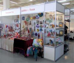 Выступать же неорганизованным «одиночником» на подобной выставке, как показал мой личный опыт, крайне тяжело. Во-первых, поскольку ты представляешь не фирму, не предприятие, а самого себя и свои работы, то все организационные и транспортные проблемы решаешь сам. Есть у тебя машина – везешь свои «поделки» сам, нет – просишь знакомых, родственников и т.д. Поскольку у меня работы, в основном, из стекла – это еще и тяжесть, которую женщине тащить на себе в другой город тяжело. Несмотря на то, что половину стоимости аренды за экспонента вносит правительство, вторую часть он все равно должен оплачивать сам. Дополнительно – оплата каждой полочки, вешалки, витрины, розеток, если тебе нужно направленное освещение. Кроме того, нужно проявлять чудеса изобретательности (что, собственно, и делали участники), чтобы заполнить грамотно, красиво свое выставочное пространство, не пользуясь ни постерами, ни скотчем (по правилам выставки, нельзя ничего лепить на белые стены – все только крепится механически).