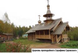Тесовая крыша с искусно вырезанными пиками на концах, узорчатая колокольня с резными столбиками, чешуйчатая луковка, увенчанная крестом. На фасаде – резная деревянная икона преподобного Серафима Саровского. Чуть дальше – поклонный крест и крытое сооружение с длинными столами для прихожан. Помимо традиционных церковных служб, здесь возрождаются сельские праздники и обычаи.